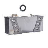 The mount consists of three parts: the main under tank plate and two clamp bodies. The under tank plate is CNC Laser Cut from 1/8 inch high strength steel plate. You can weld your own mounting brackets to the bottom if needed or utilize the 8 bolt holes already in the mount. The 2 clamp down bodies capture the top and all four sides of the tank and bolt securely to the mounting base. These parts are CNC Laser Cut but from 18 gauge steel. The parts are formed on a hydraulic press break. This mount will ensure your fuel cell is mounted securely. The Motobilt tank features one fitting on top of the tank which has a roll over valve for a vent line. The MB5005-TJ Fuel Cell already has the provisions for the clamping ring cnc cut into the tank. This means the clamping ring and pump will bolt in with no cutting or drilling necessary!